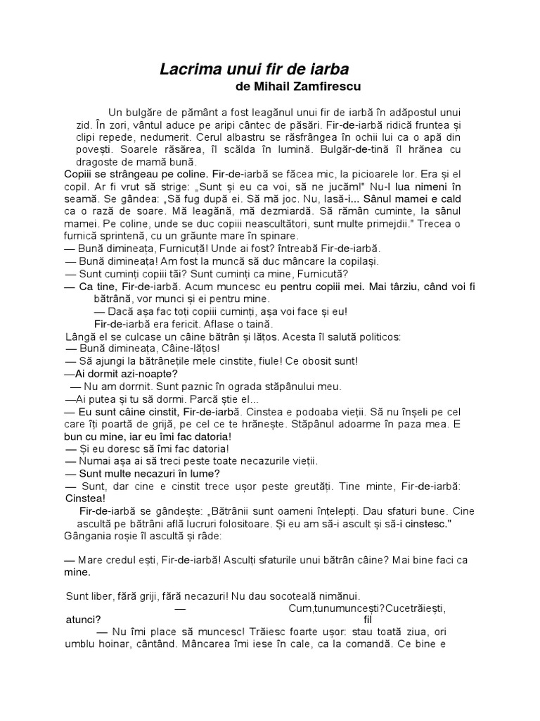 Povesteste Textul Lacrima Unui Fir De Iarba De Catre George Mihail Zamfirescu Va Rog Brainly Ro