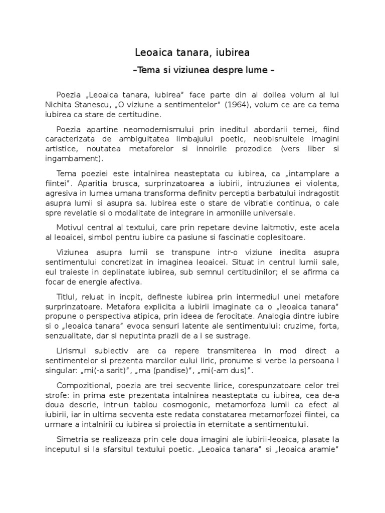 Leoaica Tanara Iubirea Tema Si Viziunea Despre Lume