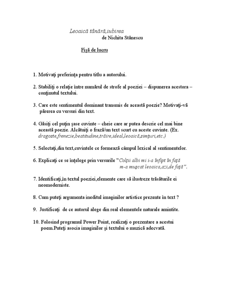Nighita Stanescu Leoaica Tanara Iubirea Comentariu Bac