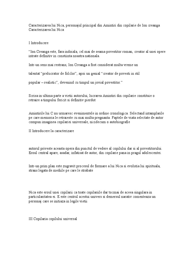 Doc Amintiri Din Copilarie Caracterizarea Lui Nica Pe Toata Opera Izabela Maria Academia Edu