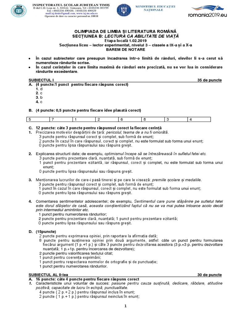 Olimpiada De Limba și Literatura Romană Secțiunea B Lectura Ca Abilitate De Viață