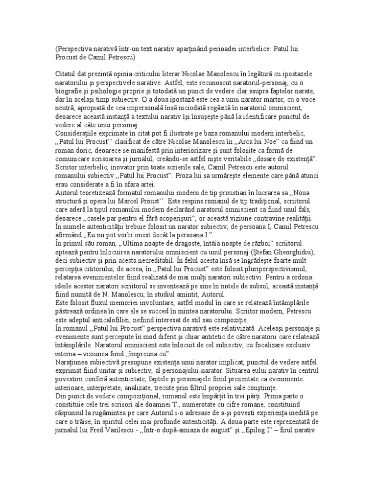 Roman De Tip Subiectiv Perspectiva Narativă Intr Un Text Narativ Aparţinand Perioadei Interbelice Patul Lui Procust De Camil Petrescu