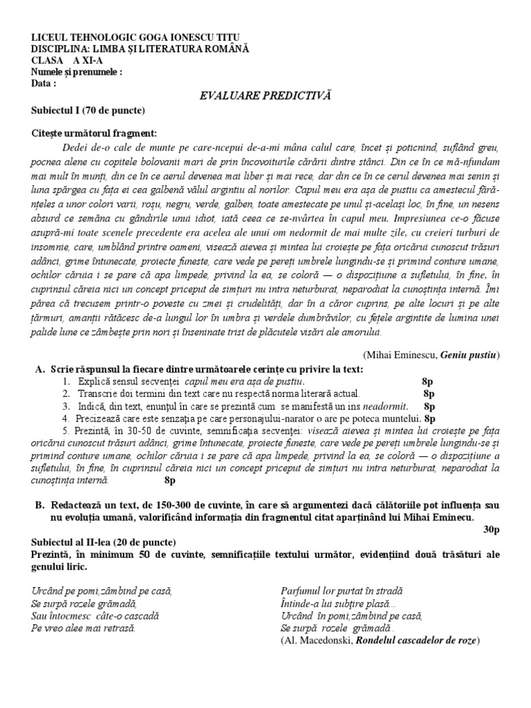 Teză Cu Subiect Unic Limba Romană Clasa A 12 A Uman și Real Semestrul 1 An școlar 2018 2019 Subiecte și Bareme Tsu Isj Ilfov Jitaruionelblog Pregatire Bac Si Evaluarea Nationala 2020 La