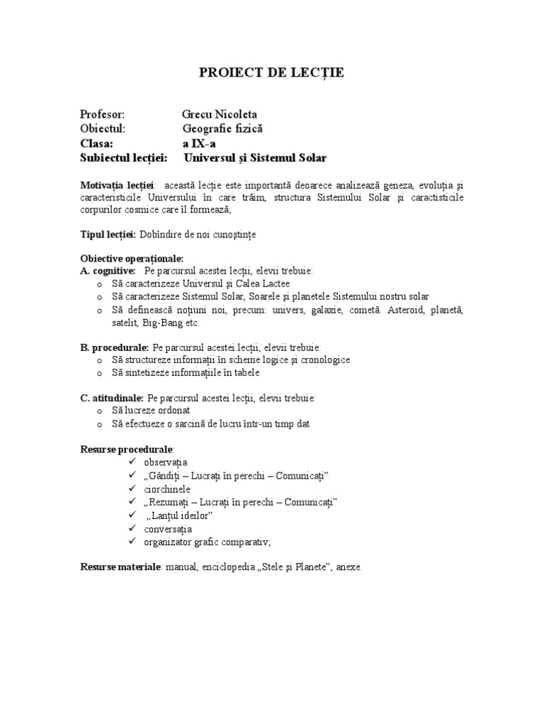 Proiect De Lectie Soarele Planetele și Viața Pe Pămant