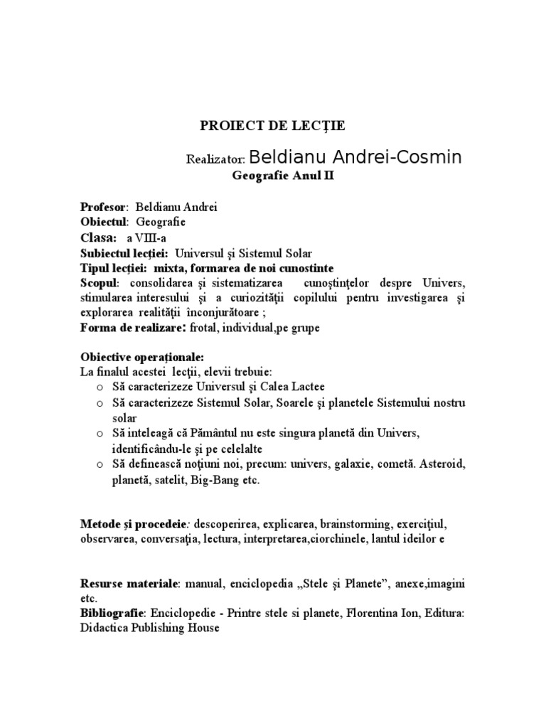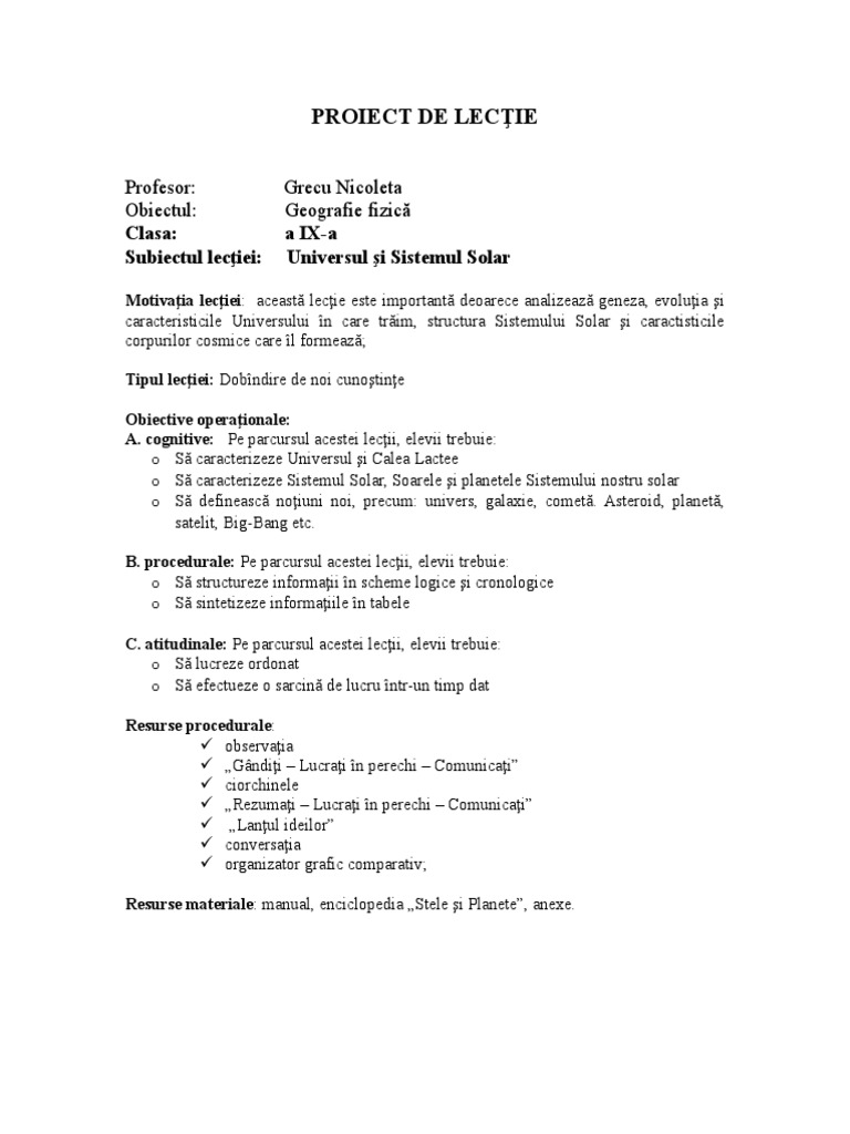 Schita Lectiei Universul Si Sistemul Solar