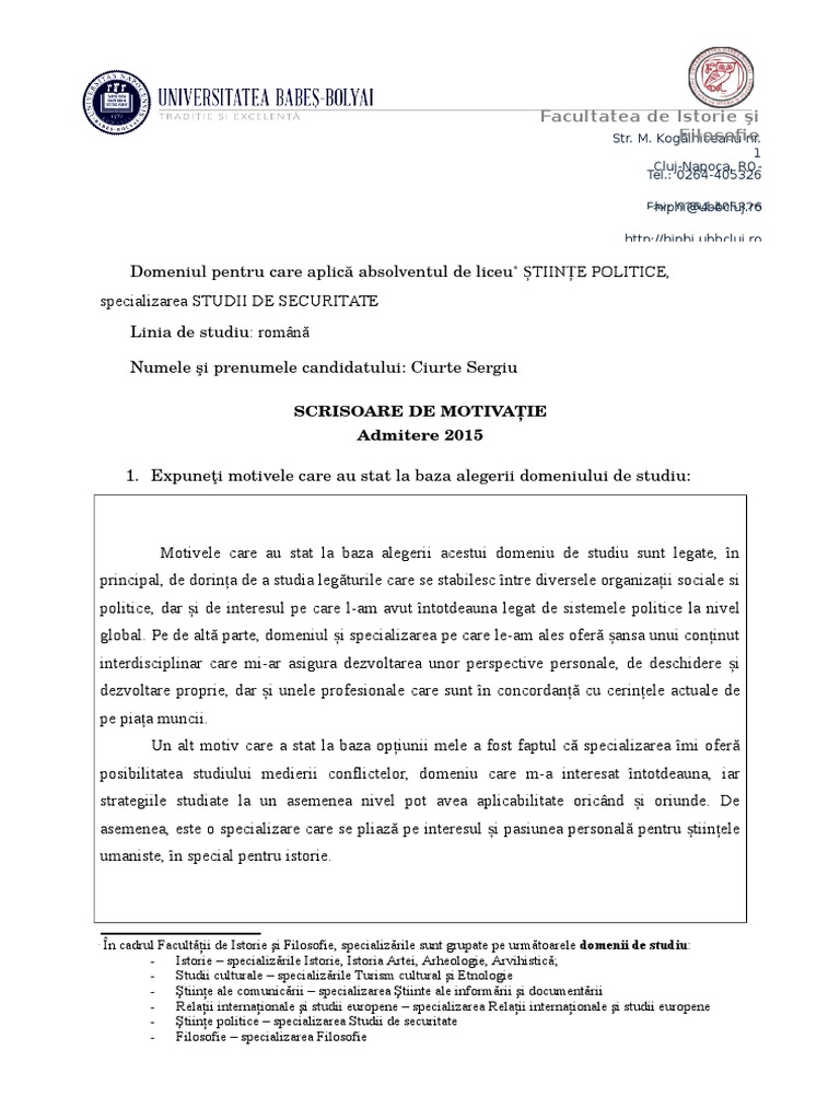 Model Scrisoare De Intentie Admitere Facultatea De Istorie