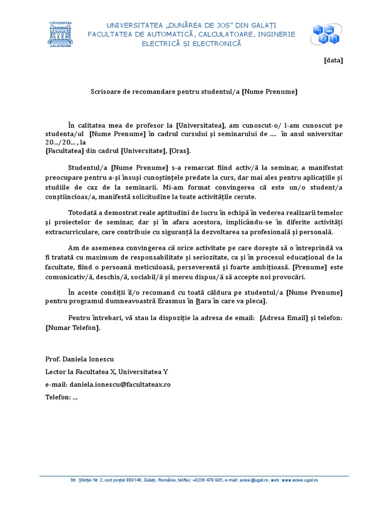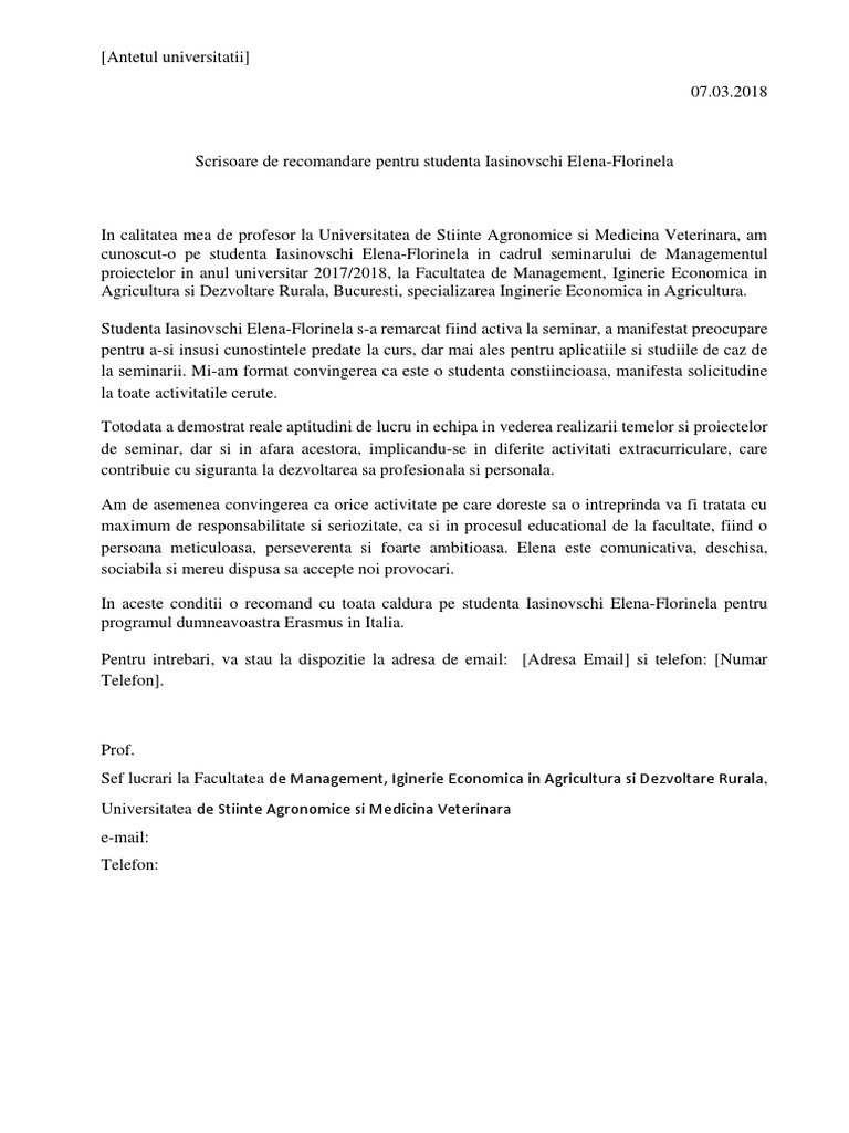 Scrisoare De Recomandare Student Erasmus